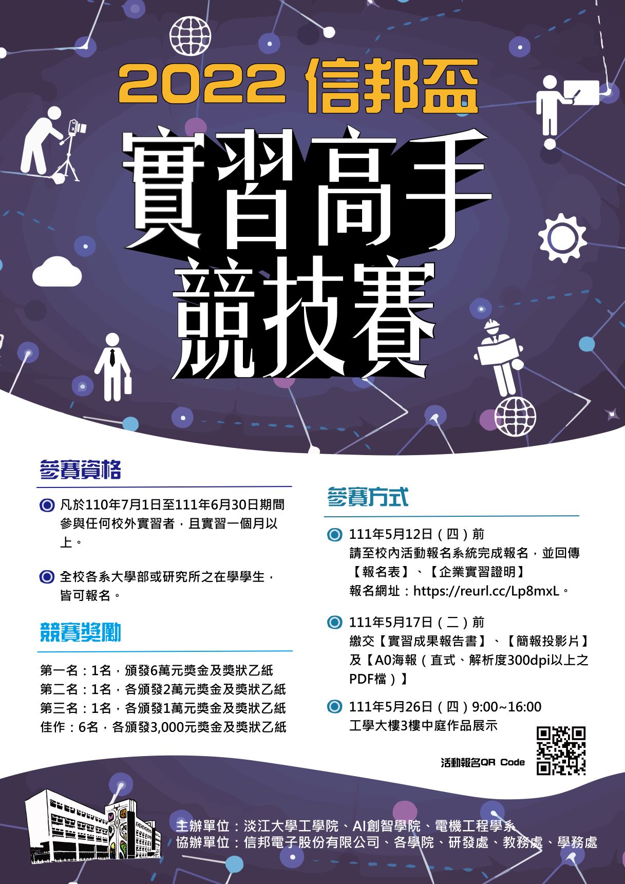 一、「2022淡江大學信邦盃實習高手競技賽」訂111年5月26日(星期四)在工學大樓3樓中庭舉辦。