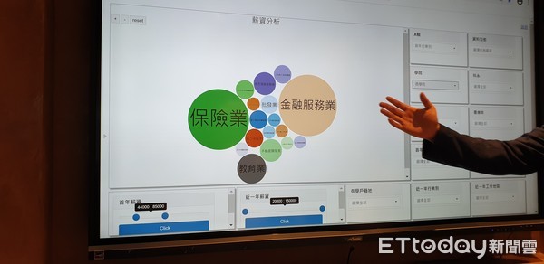 ▲AI創智學院有一套職涯導航系統,結合勞動部大數據,每個學院、科系畢業後5年內薪資的中位數、平均值、男女薪資比可如儀錶板呈現 。(圖/記者吳佳穎攝)