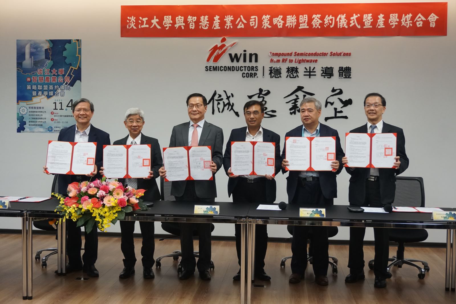 由工學院、AI創智學院及研發處共同舉辦的「淡江大學與智慧產業公司策略聯盟簽約儀式暨產學媒合會」於114日上午11時在守謙國際會議中心穩懋廳舉行,參與簽約的五家智慧產業公司分別為宜鼎國際股份有限公司、詮欣股份有限公司、人工智能股份有限公司、叡揚資訊股份有限公司及精英國際教育集團。